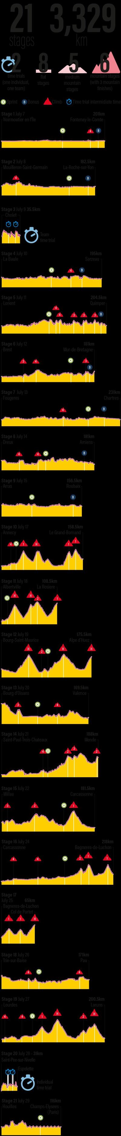 After a rest day on which the riders fly from the north coast to Annecy in France's southeast, there follows three visually stunning Alpine mountain stages, four hilly stages and three Pyrenean mountain stages inside a breathless 12 days.