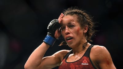• Joanna Jedrzejczyk touches her swollen forehead at the end of a round during a split decision loss to Weili Zhang. AFP