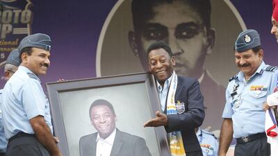 Images of Brazilian football legend Pele in India on Friday, his first visit to the country since 1977 to be in New Delhi for the Under 17 Subroto Cup final between Mainpur and the All India Football Federation team at Ambedkar Stadium. Click the arrows below to scroll through the photos.