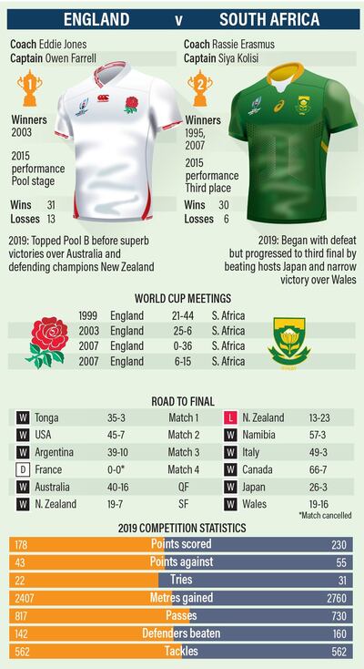 While most are predicting a battle of the forwards – none more so than Rassie Erasmus and Billy Vuinipola – it's hard to see England surrendering as much territory to the Springboks as Wales did. And while the South Africans may have pinpointed Wales' back line as susceptible under the high ball, Willie Le Roux has looked more uncomfortable than most in Japan when the ball hurtles back down to earth, so don't be surprised to see England give the Boks a taste of their own medicine in Yokohama.