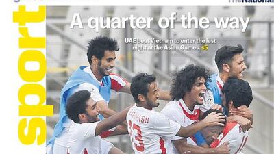 The National's Sport cover for the Saturday, September 27 issue, features jubilant UAE Under-23 footballers, who stayed on course to reprise their Asian Games medal-winning performance of four years ago when they registered a 3-1 win on Friday over Vietnam in Incheon, South Korea.