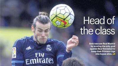 Gareth Bale towers on The National Sport front page on Sunday, May 1, 2016 after his ninth headed goal of the season ensured Real Madrid kept pace in the Primera Liga title race.