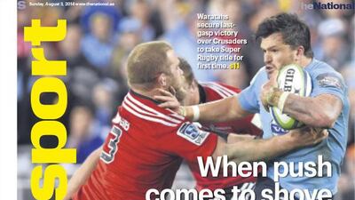 The National's Sport cover for Sunday, August 3, featuring New South Wales Waratahs, who beat Canterbury Crusaders in a thrilling Super Rugby final.