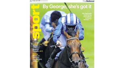 The National's cover for the Sunday, July 27, issue, featuring Sheikh Hamdan bin Rashid's prize-winning filly Taghrooda, a winner at Ascot.