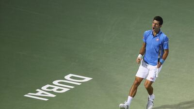 Novak Djokovic prepares to serve during his win over Vasek Pospisil on Tuesday at the Dubai Duty Free Tennis Championships. Ali Haider / EPA