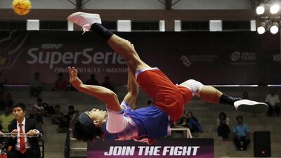 World No 1 and top-seeded Thailand punctured all hopes Malaysia had of an upset in front of a disciplined and passionate 3,000 fans with a 22-20, 21-14 victory in the ISTAF Super Series finals on Friday. The sport of sepak takraw, or kick volleyball, is a sport native to Southeast Asia. Sepaktakraw differs from the similar sport of volleyball in its use of a rattan ball and only allowing players to use their feet, knee, chest and head to touch the ball. Click on the arrows to scroll through the photos.