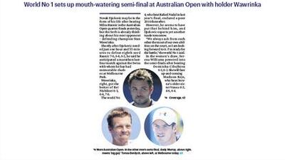The National Sport front page on Thursday, January 29 features tennis world No 1 Novak Djokovic after he set up a semi-final showdown with defending Australian Open champion Stanislas Wawrinka.
