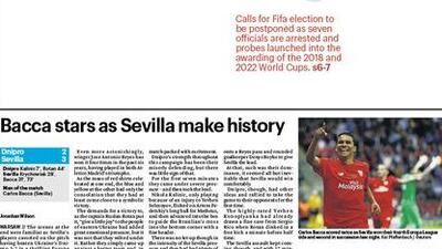The Fifa corruption scandal is the focus of The National Sport’s cover on Thursday, May 28, while Europa League champions Sevilla feature downpage after retaining the trophy with a thrilling 3-2 victory over Dnipro Dnipropetrovsk.