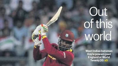 The National's Sport cover for Thursday, March 16 issue features Chris Gayle, who scored the fastest century in World Twenty20 cricket as West Indies thumped England by six wickets in their Group 1 match in Mumbai on Wednesday.