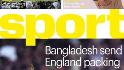 The National's Sport cover for the Tuesday, March 10 issue, featuring Bangladesh defeating – and eliminating – England at the 2015 Cricket World Cup.