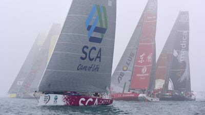 Images from the Leg 3 start of the Volvo Ocean Race on Saturday in foggy Abu Dhabi. The third leg will tkae the fleet of six boats from the Arabian Gulf to Sanya, China over the next three weeks. Click the arrows above to scroll through the photos.