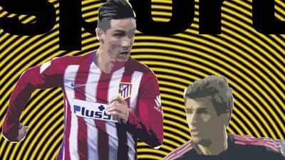 An illustration of Atletico Madrid striker Fernando Torres and Bayern Munich forward Thomas Muller by designer Kevin Jeffers adorns the front cover of The National Sport on Wednesday, April 27, 2016.