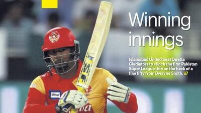 The National's Sport cover for the Wednesday, February 24 issue, featuring Dwayne Smith and Islamabad United as they were crowned inaugural Pakistan Super League champions.