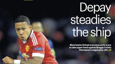 The National's Sport cover for the Wednesday, August 19 issue, featuring Memphis Depay as Manchester United took a commanding 3-1 advantage over Club Brugge in the Champions League play-off round.