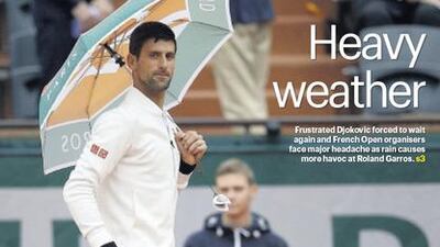 World No 1 Novak Djokovic makes the cover of The National Sport on Wednesday, June 1, 2016 as he inspects the Centre Court at Roland Garros on another rain-affected day at the French Open using an umbrella borrowed from a spectator.