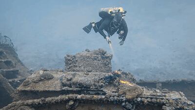 Elsewhere, scores of 500lb and 1,000lb artillery shells are piled high alongside countless bullets, large stocks of torpedoes and depth charges. On her decks are three battle tanks, in place since she came to a thunderous rest on the seabed in 1944.
