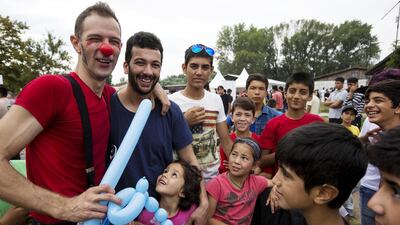 The refugees at the centre – many of whom had risked their lives escaping Syria and Afghanistan – were treated to entertainment featuring clowns, choirs and folk dances, before receiving their gifts.