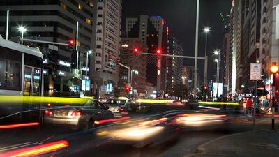“I looked around and thought this reminds me of Times Square in New York,” she says. Hamdan Street’s neon lights, its lively pedestrian-packed streets and, above all, its incessant movement in the hours after darkness, drew her towards this conclusion.