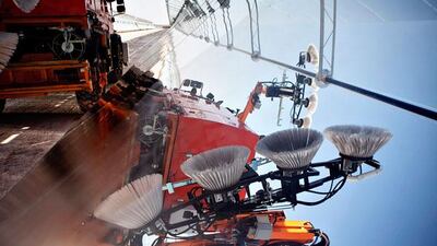 Having repeatedly travelled out to Shams1 over the last few weeks to spend the day photographing the facility, Silvia Razgova faced a real challenge on the day of the inauguration to find something that looked different from the hundreds of previous images she had filed. She rose to the challenge with a great file including this wonderful, dizzying use of the reflective surfaces of the array to show what the cleaning process looks like.