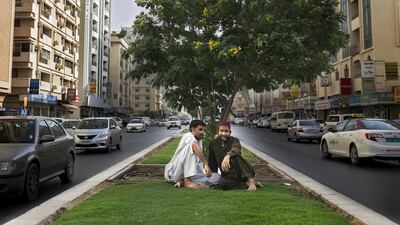 Staff photographer Reem Mohammed found these two gentlemen enjoying the shade of a tree on a thin strip of green intersecting the urban density of Al Ghuwair.