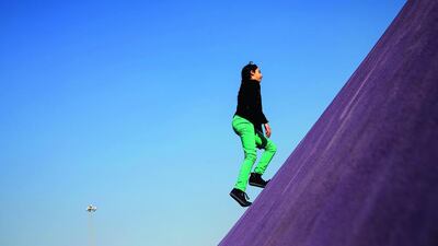 There are so many things tricking the eye in this photo it’s hard to know where to start. How is she climbing a slope that steep? Is this a real person or a very realistic sculpture? What exactly is the sense of scale? How big or small are things? Is the light standard int he background helping my eye figure out the mystery or adding to it? Finally I had to ask the photographer what I was seeing. Her reply was simply, “Sticky surface, grippy shoes.”