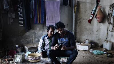 Staff photographer Sarah Dea captured this quiet moment between two men who build traditional wooden boats in Ajman checking a phone during a break.