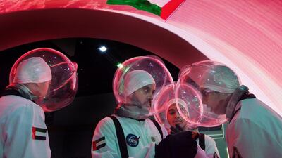 Four young men – from left, Salman Sadiq, 20; Munzir Saifullah, 20; Yousef Ibrahim, 20; and Craig Creado, 20 – were on the scene in spacesuits to promote the UAE space programme.