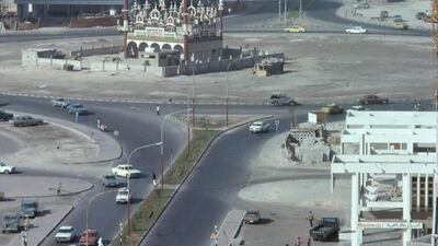 Captured by the French photographer Alain Saint-Hilaire as he made one of his many airborne forays over the capital, the picture focuses on the dusty roundabout at the junction of the roads then known as Khalifa Street, Al