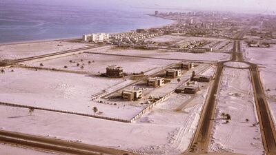 The view shows Abu Dhabi island, looking more or less north across Khalidiya. Imediately in the foreground is a round building used as a meeting hall, now demolished, and a row of government buildings, which still stand. The image is bisected by Zayed the First Street, which starts with a roundabout under construction and the sandy foundations of what is now King Abdullah bin Abdulaziz Al Saud Street.