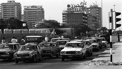 This set of lights is at the junction of Sheikh Rashid Bin Saeed Street, popularly known as Airport Road, and Zayed the First Street, sometimes called Electra. Also visible in the photo are two old-style city taxis – before the introduction of the white and gold model – and a splendid Toyota Land Cruiser pickup. Today, this junction is much wider, with a three-lane underpass beneath Zayed the First Street, demonstrating that Abu Dhabi, like traffic, must always be ready to move on.