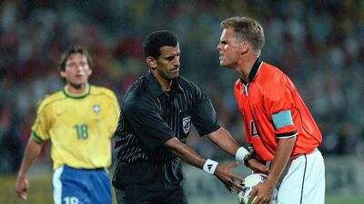 A former player for Al Nasr, Bujsaim took up refereeing after retiring from football in 1983. He is shown here reclaiming the match ball from the Dutch defender Frank de Boer,with match eventually won on penalties, 4-2, by Brazil.