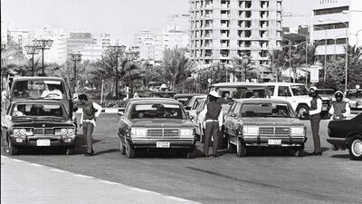 The photograph, published in Al Ittihad in 1984, shows what was described as an inspection campaign to “raise awareness and interest in the ethics of the road”.