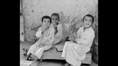 Here in this image are all the elements of an Abu Dhabi childhood 50 years ago. There are no expensive toys or electronic gadgets, just impish grins of delight at a snack of biscuits perhaps provided by the photographer, with an old crate for a table.