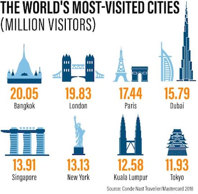 The three cities last week topped the annual MasterCard survey of the world's most-visited cities. Dubai is certainly up there – in fourth place – but under a new strategy revealed on Wednesday by the Crown Prince of Dubai, Sheikh Hamdan bin Mohammed, it is aiming for the top spot.