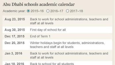 The graphic is a summary of the Abu Dhabi Education Council's academic calendar for the academic years 2015 through 2018. The calendar applies to all public and private schools in the emirate.