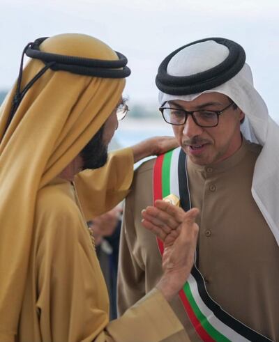 President Sheikh Mohamed applauds while Sheikh Mohamed bin Rashid, Vice President and Ruler of Dubai, awards Sheikh Mansour bin Zayed, Deputy Prime Minister and Minister of the Presidential Court, with the Mohammed bin Rashid Sash. All photos: UAE Presidential Court