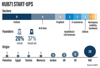 She said the collaboration with California accelerator Plug and Play is doing a good job of outsourcing a pipeline of potential start-ups, and that ADGM, the financial free zone on Al Maryah where Hub71 is headquartered, is attracting companies that need to be regulated and creating a place for founders “that isn’t too cumbersome” from an affordability or compliance standpoint.