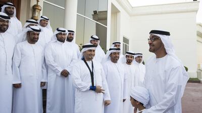 ABU DHABI // Sheikh Mohammed bin Rashid, Vice President and Ruler of Dubai and Sheikh Mohammed bin Zayed, Crown Prince of Abu Dhabi and Deputy Supreme Commander of the Armed Forces, received Armed Forces servicemen who have recovered from injuries sustained during Operation Restoring Hope in Yemen, at Qasr Al Bahr Palace on Monday.