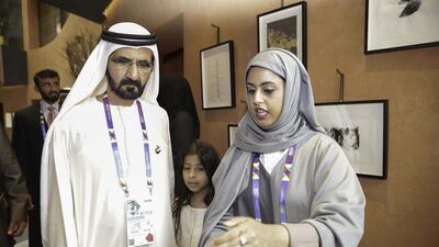 The Vice President watched a short film, 'Family Tree', in which the actress Mahra Mustafa, 8, plays a girl who learns that the values and experiences of past generations can help in the quest for a sustainable future. Photos: Wam