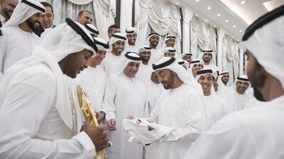 Sheikh Mohammed bin Zayed, Crown Prince of Abu Dhabi and Deputy Supreme Commander of the Armed Forces, hosted an iftar reception at Al Bateen Palace on Tuesday where he met with high ranking members of the UAE Armed Forces and Ministry of Interior and was presented with an Al Jazira Football Club shirt.
