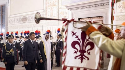 Sheikh Mohammed bin Zayed, Crown Prince of Abu Dhabi and Deputy Supreme Commander of the Armed Forces, second left, is received by Matteo Renzi, Prime Minister of Italy, left, at the Museo di Palazzo Vecchio. Ryan Carter / Crown Prince Court - Abu Dhabi