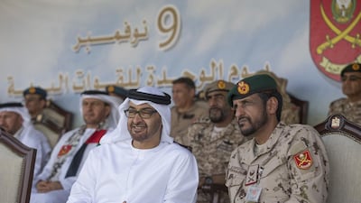 Sheikh Mohammed bin Zayed, Crown Prince of Abu Dhabi and Deputy Supreme Commander of the UAE Armed Forces and other UAE leaders attend the 26th Anniversary Ground Forces unification celebrations at Zayed Military City in Abu Dhabi.