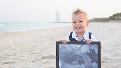 Sitting on the beach with the Burj Al Arab in the background, they hold early snaps of themselves. The black and white baby photos of tiny preemies with tubes to help them breathe vividly contrasts with the lively children propping up the frames.