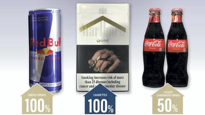A can of Monster - a highly-caffeinated energy drink - will rise from Dh6 to Dh12, for example, while a packet of 20 Marlboro cigarettes will rise from Dh11 to Dh22. This brings the cost much closer to the prices often seen in Europe. But cut price brands currently selling for Dh2 per pack will only increase to Dh4, as there is no minimum price set out by the government.