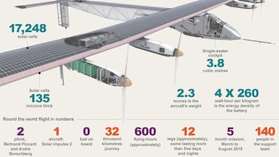 Weighing the equivalent of a standard sedan car, the Solar Impulse plane will take about 600 flying hours to go around Earth without fuel.
