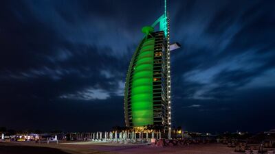 DUBAI // The Burj Al Arab in Dubai and Yas Viceroy hotel in Abu Dhabi went green on Thursday in celebration of St Patrick’s Day.