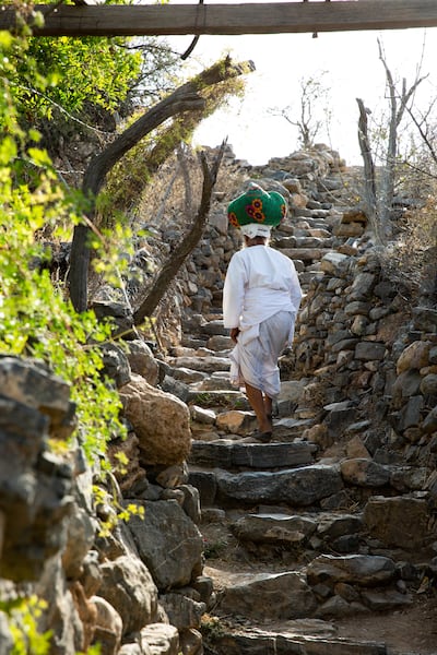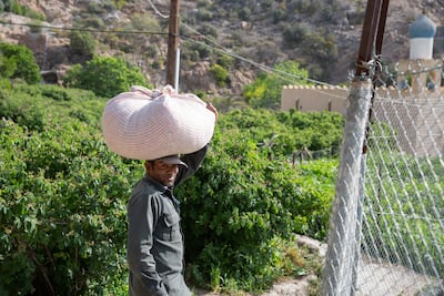 Harvesting roses is still largely carried out by the ageing population in the villages. Omani villager Nasser, 80, walks up a stone stairway with freshly picked roses wrapped in a cloth on his head in Al Ayn village. Nasser has his own rose garden and factory where he processes the flowers.