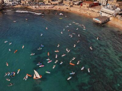An aerial view shows people paddleboarding off the coast of northern Lebanese city Batroun. AFP