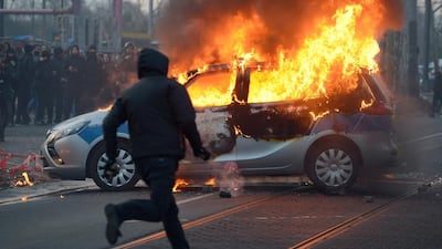 Demonstrators set three police cars alight and two officers were injured on Wednesday as authorities confronted anti-austerity protesters trying to blockade the inauguration ceremony for the European Central Bank’s new headquarters in Frankfurt, Germany.