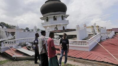 An Indonesian soldier inspects a collapsed mosque after the earthquake. Hotli Simanjuntak / EPA